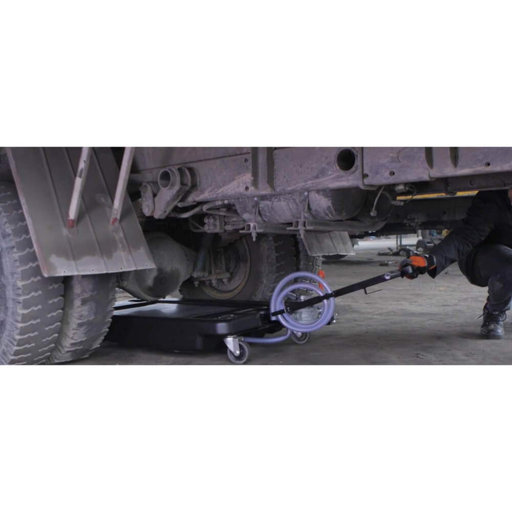 • El desagüe cuenta con cuatro ruedas de nailon de 4" (100 mm) para una mejor maniobrabilidad, un colgador de manguera para guardarla de forma segura cuando no se utiliza y una bandeja anti salpicaduras extraíble que evita que entren residuos en el depósito. También incluye deflectores en el interior del depósito para evitar derrames de aceite durante el transporte.