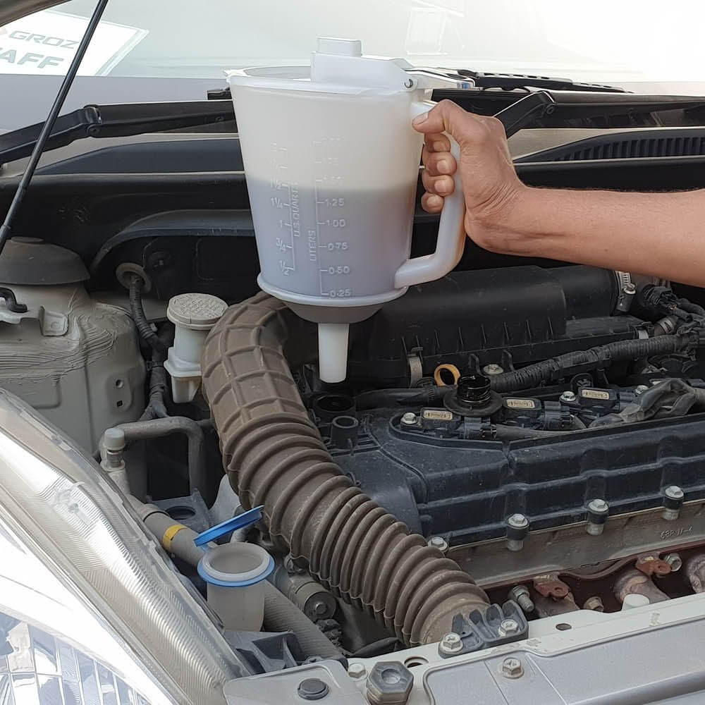 • Un embudo con graduaciones que se puede utilizar para transferir la cantidad medida de líquido sin derrames ni salpicaduras.